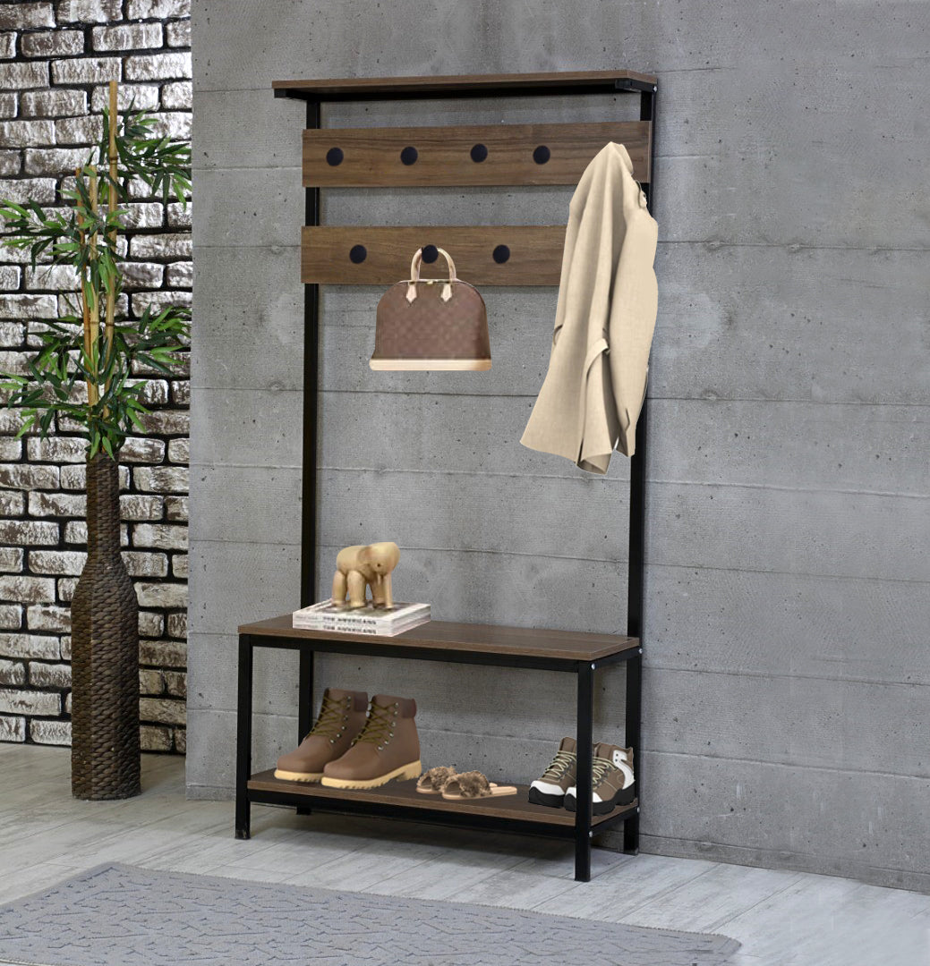 - ארגון אוניברסלי: מתלה עליון לתליית בגדים עם מדפי עץ לארגון נעליים או תיקים.
