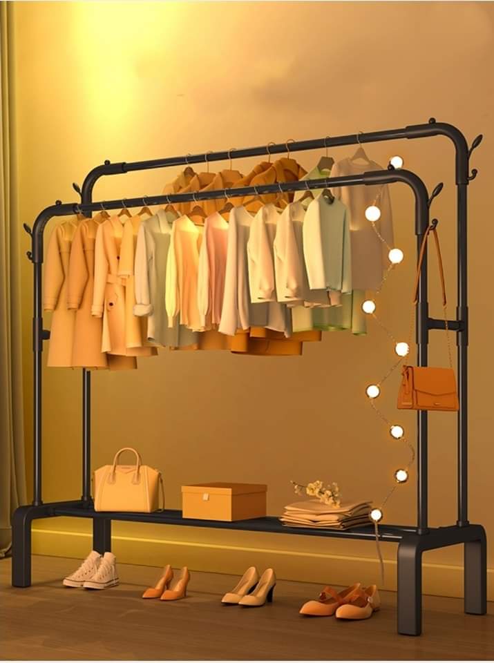 אנו מציעים לכם מעמד מתכת לארגון בגדים המכיל מתלה צד ומדפים תחתונים