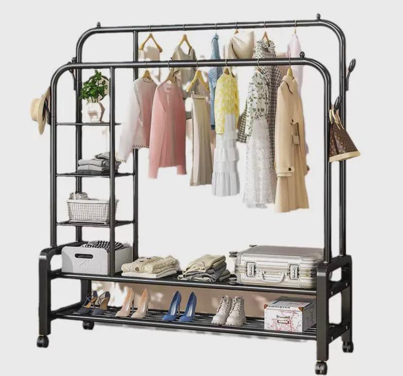 מעמד בגדים כפול עם מדפי צד ומדף תחתון 12-3
