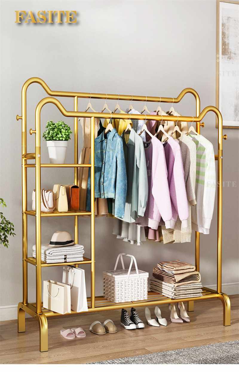 ستاند ملابس معدني مزدوج باللون الذهبي مع رفوف جانبية