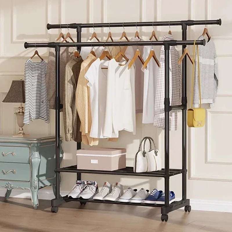 מעמד בגדים מתכת כפול עם מדפים להנחת נעליים