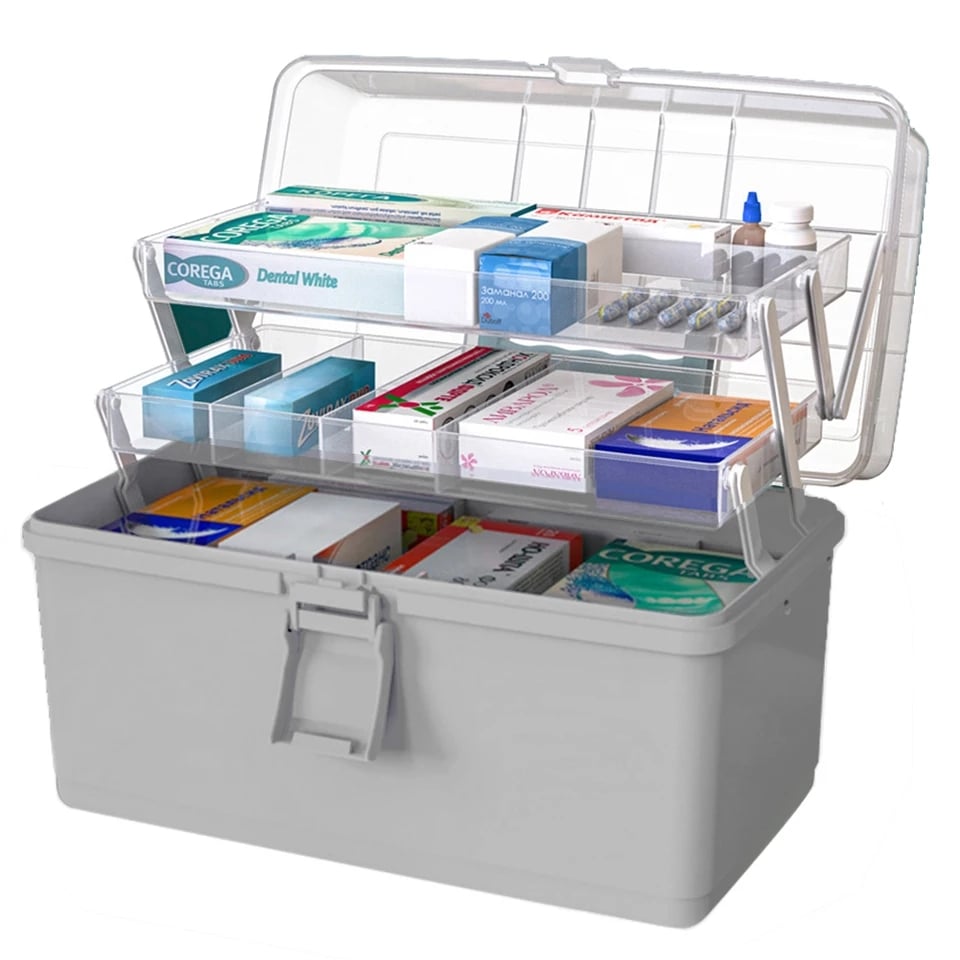 קופסת פלסטיק מעשית לארגון תרופות וציוד רפואי. הוא מכיל מספר מדפים עם כיסוי אטום להגנה על תרופות מפני לחות ואבק.