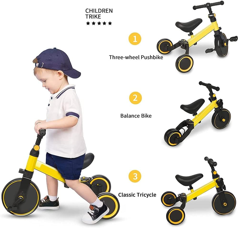 - يمكن تعديل الدراجة لتناسب مراحل نمو الطفل، بحيث تتحول من دراجة ثلاثية العجلات إلى دراجة توازن أو دراجة ذات عجلتين مع إضافة أو إزالة بعض الأجزاء.