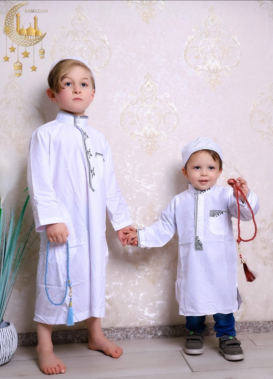طقم أنيق ومميز للأطفال يتكون من دشداشة وطاقية باللون الأبيض الناصع، مصمم خصيصًا ليناسب المناسبات الرسمية والدينية. يمنح طفلك مظهرًا أنيقًا ومريحًا طوال اليوم.