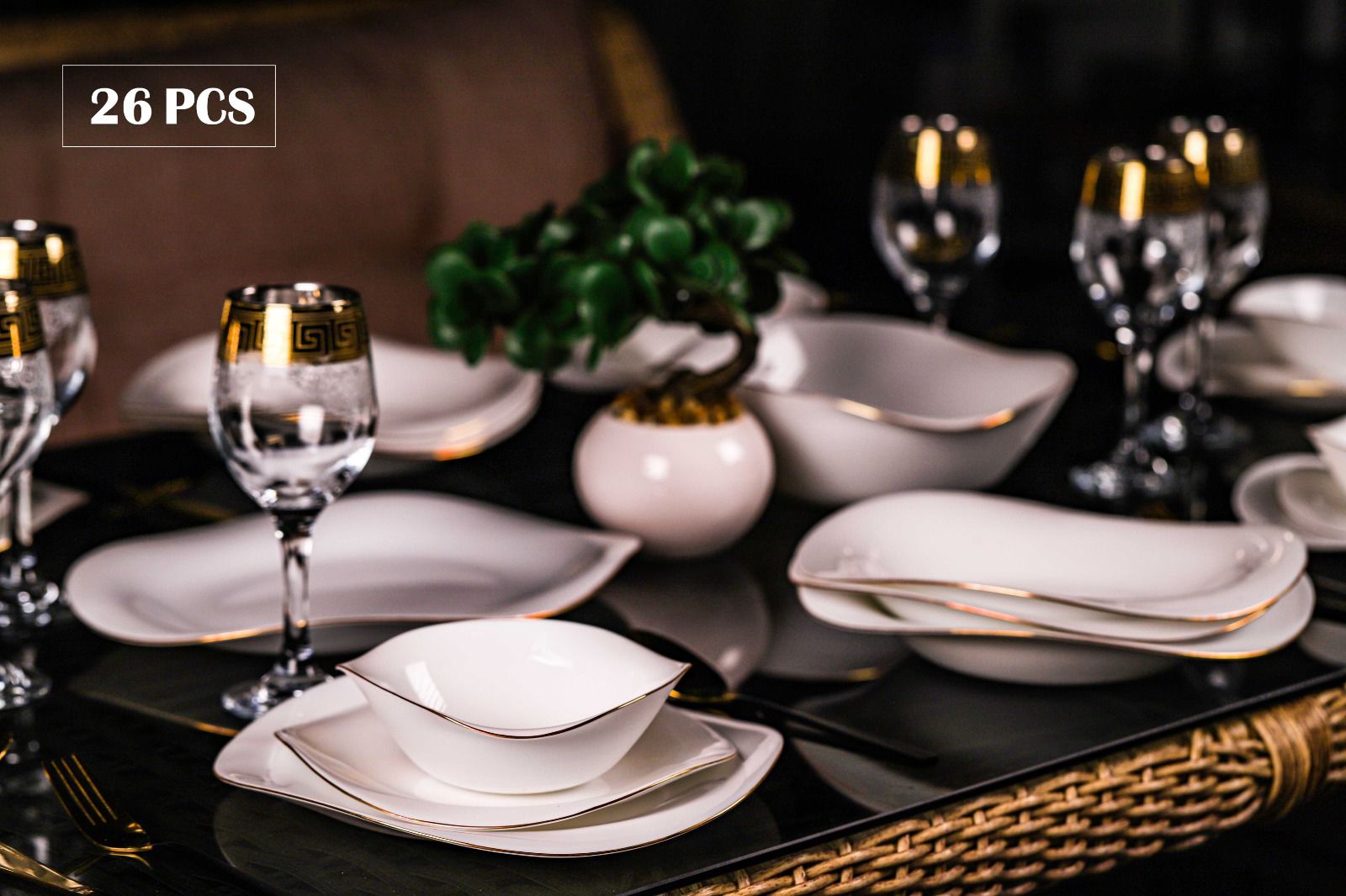 طقم صحون مكون من 26 قطعة باللون الابيض مع الذهبي