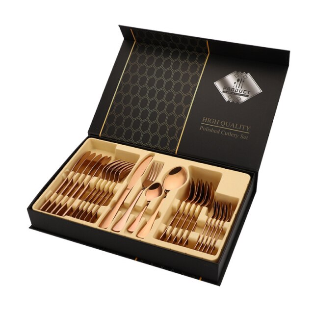 أضف لمسة من الفخامة والأنوثة إلى طاولتك مع طقم الملاعق والشوك المكون من 24 قطعة، الذي يتميز باللون الذهبي الفاخر والجودة العالية ليكمل إطلالتك الأنيقة في كل مناسبة.