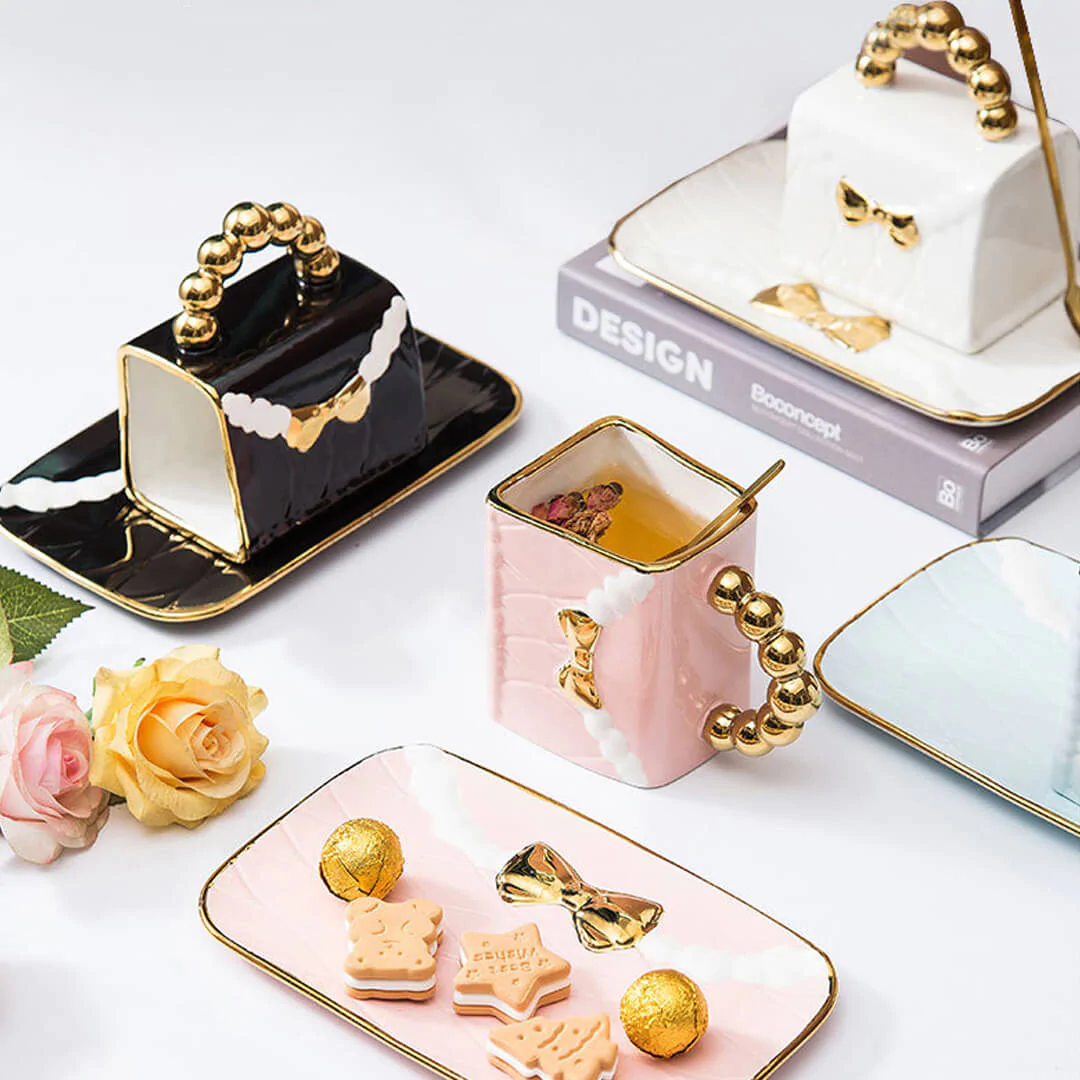 مج بورسلين على شكل حقيبة مع صحن ومعلقة